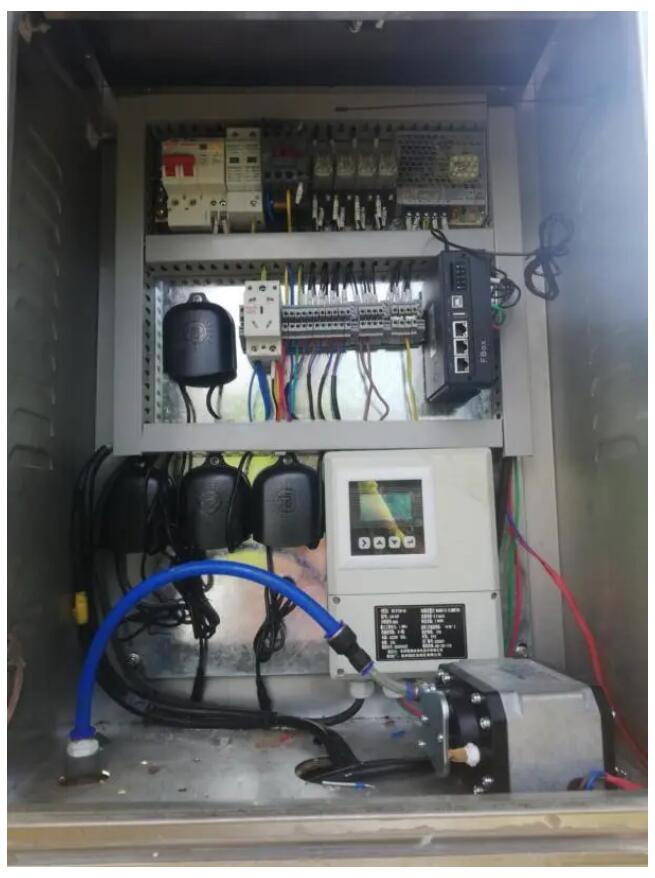 鄒工在現(xiàn)場調(diào)試,電磁流量計進(jìn)行計量,數(shù)據(jù)通過云平臺進(jìn)行監(jiān)控,現(xiàn)場總計裝有56臺分體式電磁流量計。