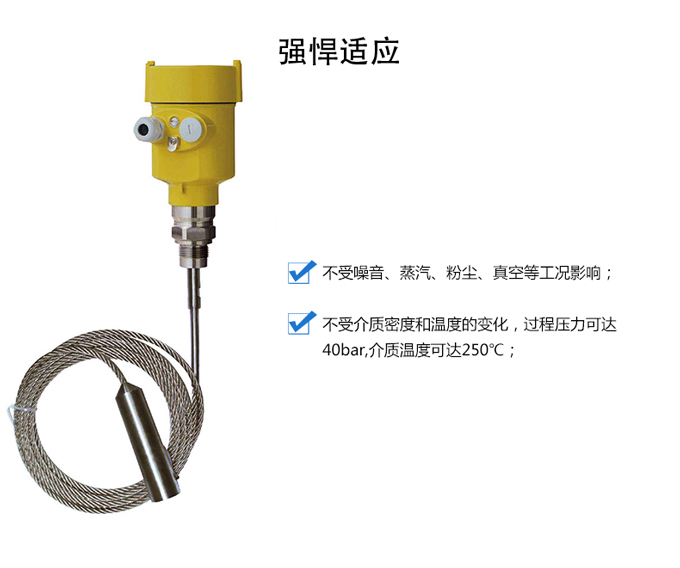 導波雷達是基于時間行程原理的測量儀表,雷達波以光速運行,運行時間可以通過電子部件被轉換成物位信號。探頭發(fā)出高頻脈沖并沿纜式或桿式探頭傳播,當脈沖遇到物料表面時反射回來被儀表內的接收器接收,并將距離信號轉化為物位信號。
