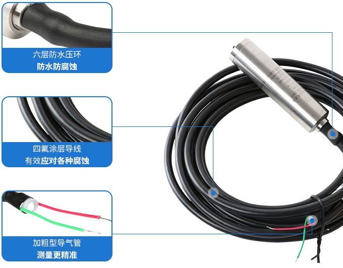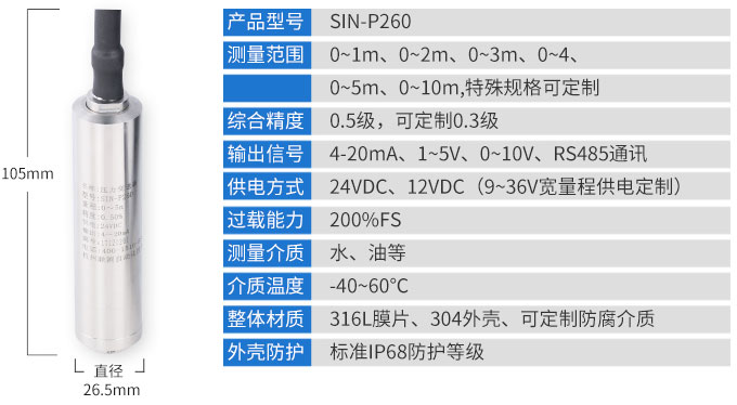 SIN-P260投入式液位變送器由高性能擴散硅壓阻式壓力傳感器作為測量元件,把與液位深度成正比的液體靜壓力準確測量出來。