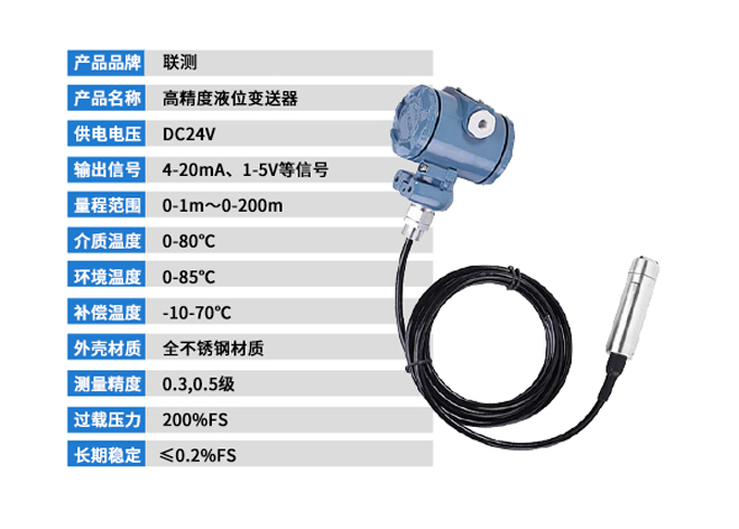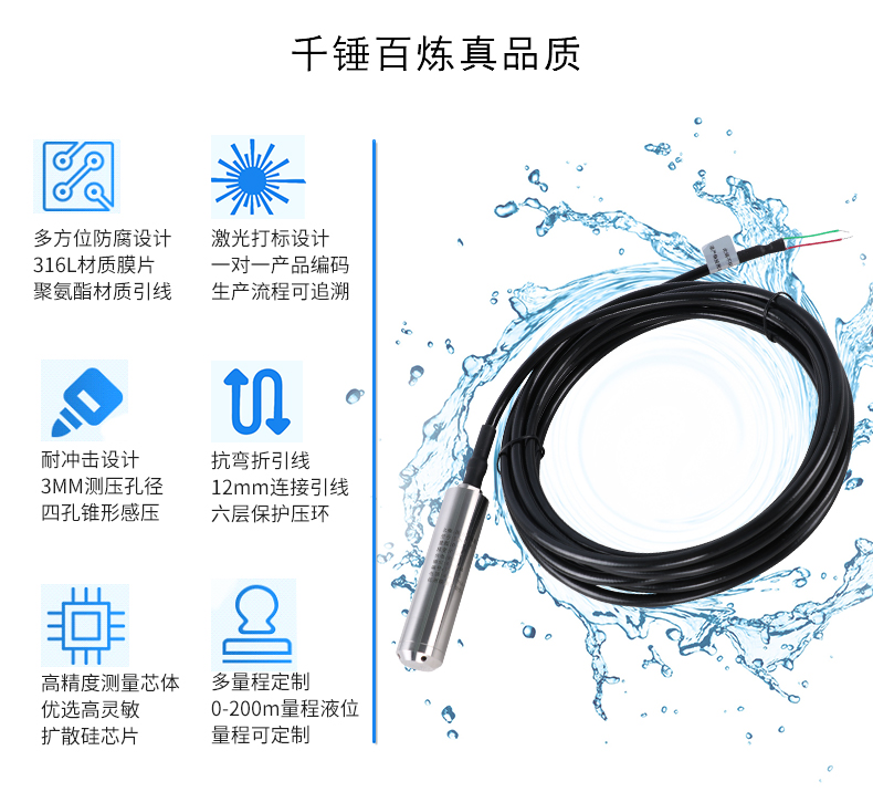 SIN-P261投入式液位變送器由高性能擴(kuò)散硅壓阻式壓力傳感器作為測(cè)量元件,把與液位深度成正比的液體靜壓力準(zhǔn)確測(cè)量出來(lái),并經(jīng)過信號(hào)調(diào)理電路轉(zhuǎn)換成標(biāo)準(zhǔn)(電流或電壓)信號(hào)輸出,建立起輸出信號(hào)與液體深度的線性對(duì)應(yīng)關(guān)系,實(shí)現(xiàn)對(duì)液體深度的測(cè)量。產(chǎn)品精度高、體積小,直接投入液體中,即可測(cè)量出變送器末端到液面的液體高度,使用方便。適用于石油、化工、電廠、城市供水、水文勘探領(lǐng)域的液位測(cè)量與控制。經(jīng)過長(zhǎng)期老化及穩(wěn)定性篩選,產(chǎn)品性能穩(wěn)定可靠,能夠適用應(yīng)用于環(huán)境比較惡劣的露天現(xiàn)場(chǎng),同時(shí)能夠現(xiàn)場(chǎng)液位顯示,零點(diǎn),滿程可遷移。